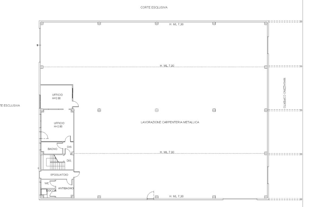 L’immobile presenta un’altezza sotto trave di 7,90 metri, che lo rende particolarmente funzionale per lavorazioni e stoccaggio.