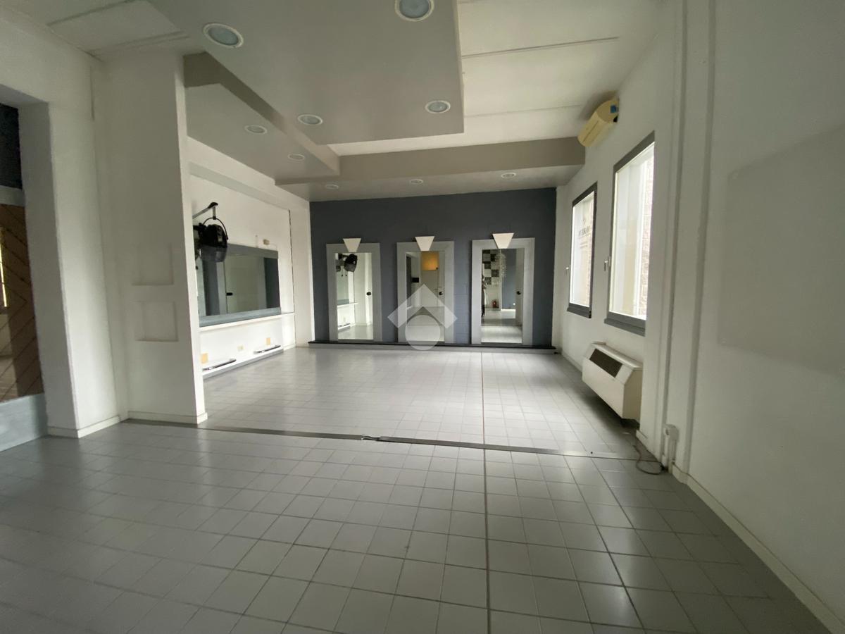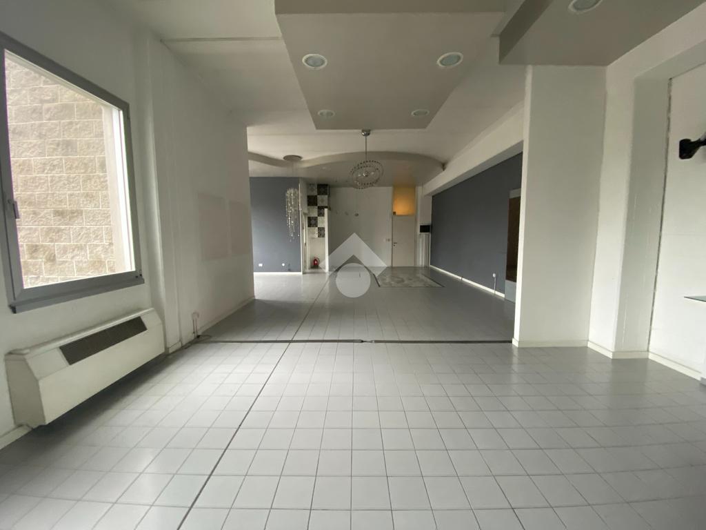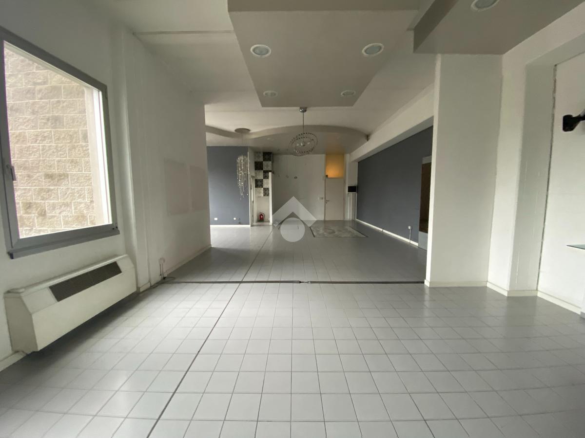 Proponiamo in locazione, al primo piano di uno stabile posizionato su strada di forte passaggio, locale commerciale di circa 95 mq con servizio di pertinenza e parcheggio riservato allo stabile.