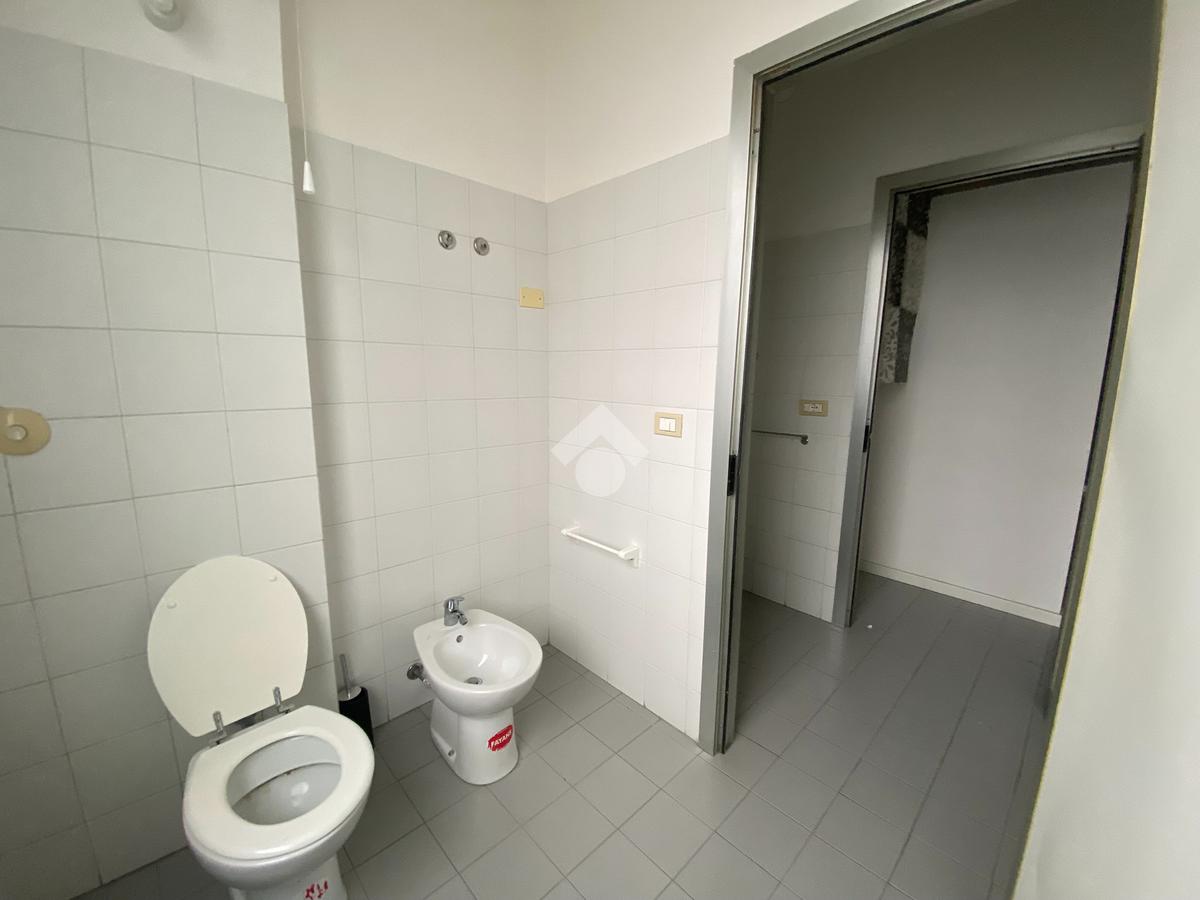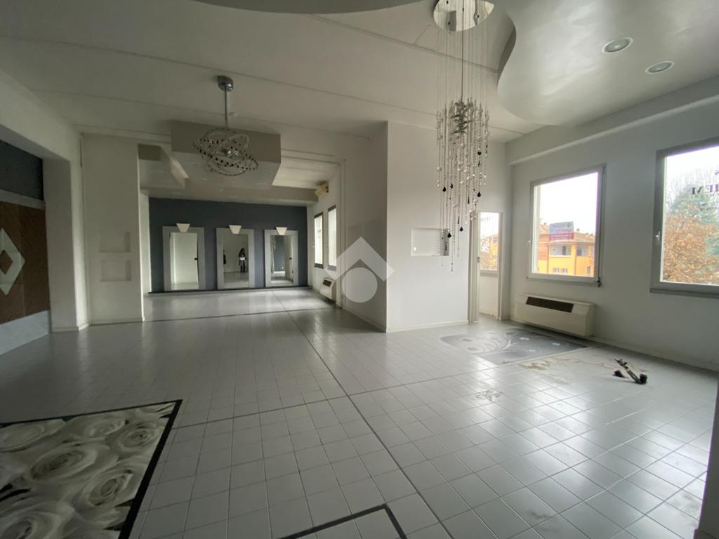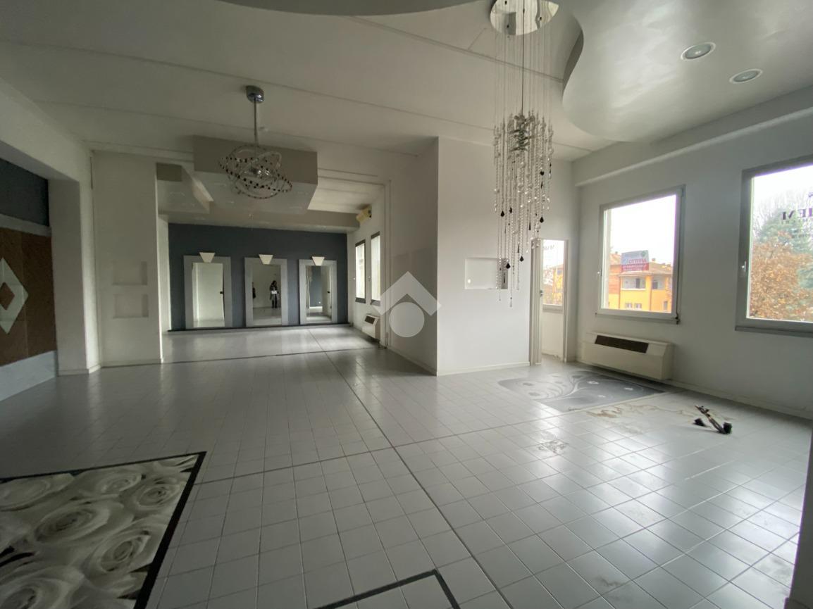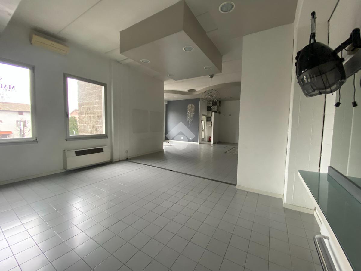 Proponiamo in locazione, al primo piano di uno stabile posizionato su strada di forte passaggio, locale commerciale di circa 95 mq con servizio di pertinenza e parcheggio riservato allo stabile.