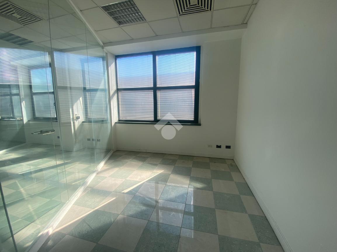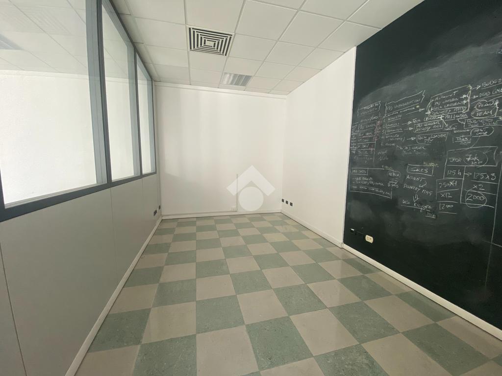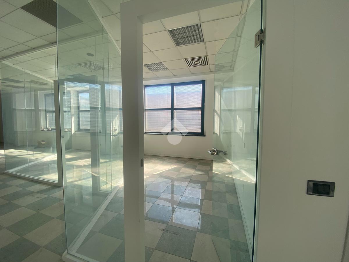 Attualmente l’ufficio è suddiviso in cinque ambienti distinti tramite pareti mobili e in vetro, una soluzione che offre flessibilità nella riorganizzazione degli spazi secondo le proprie esigenze.