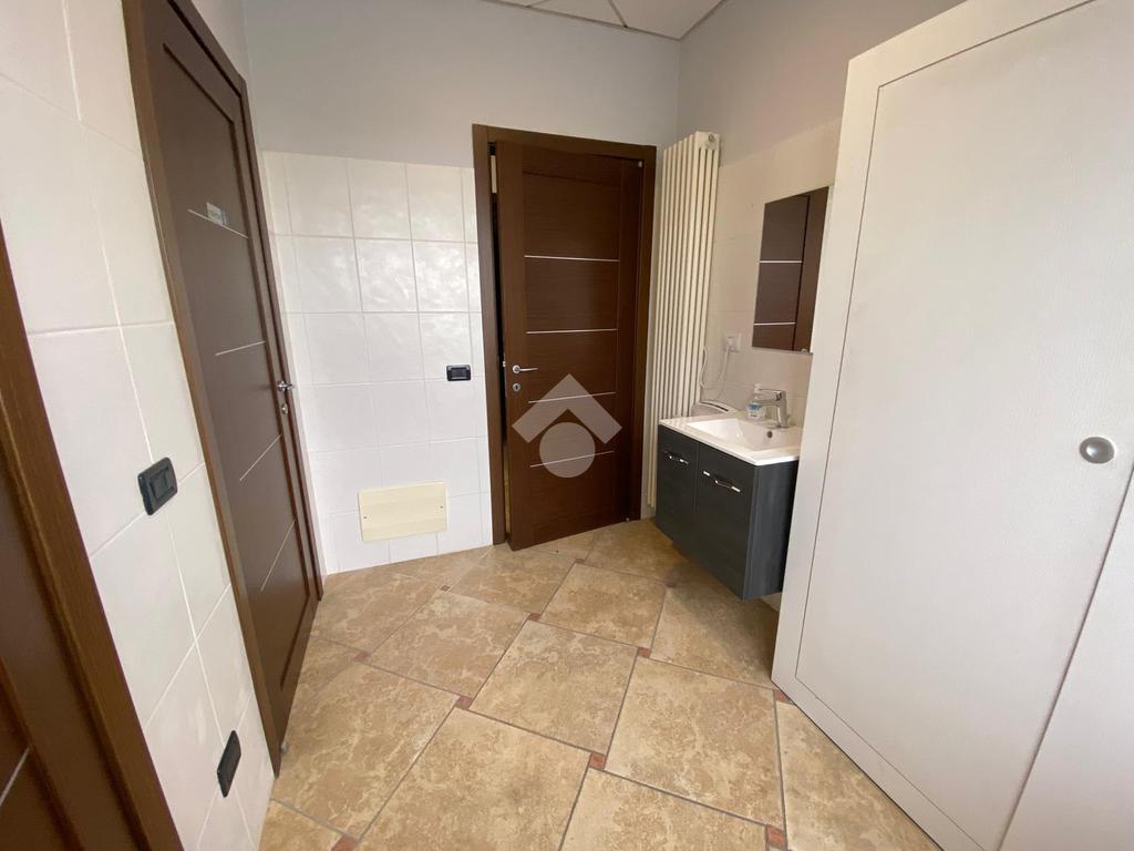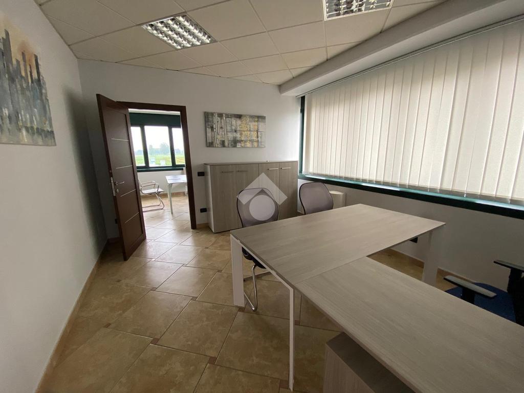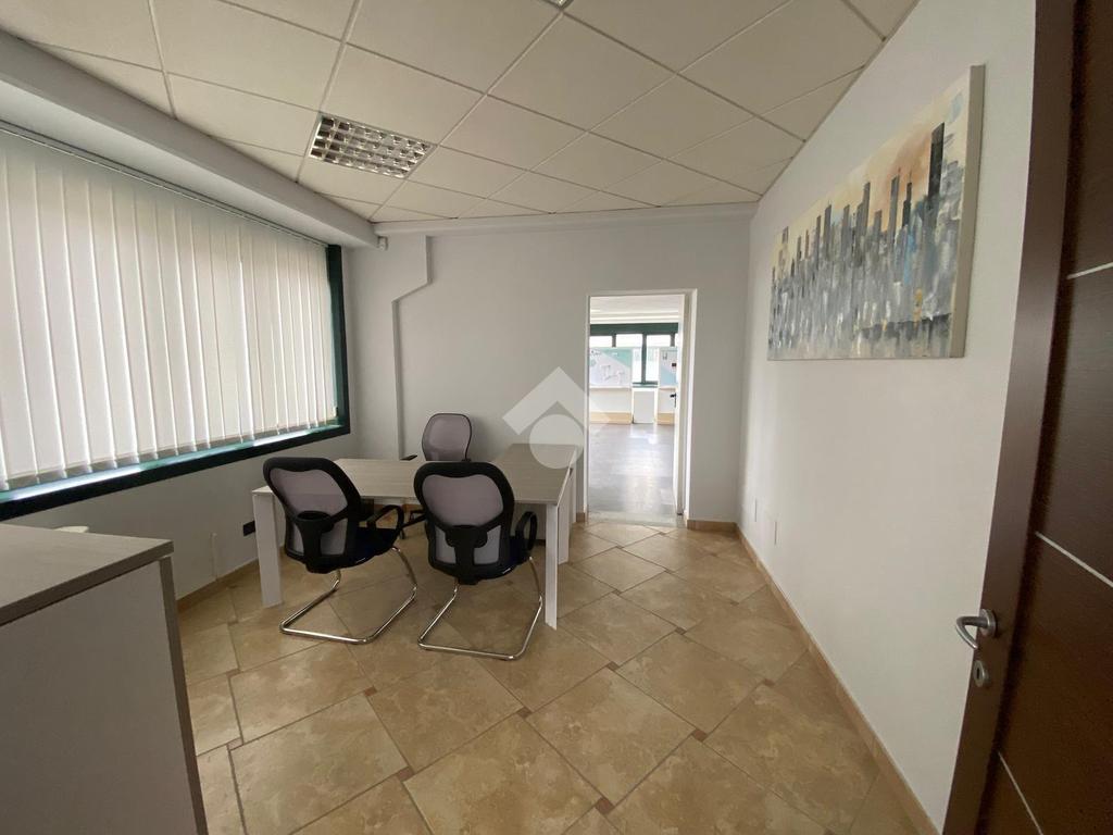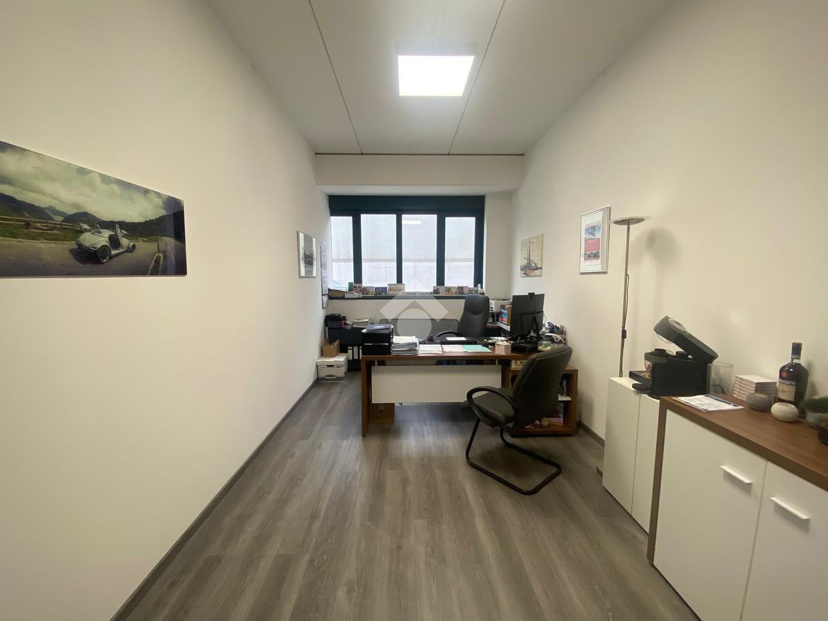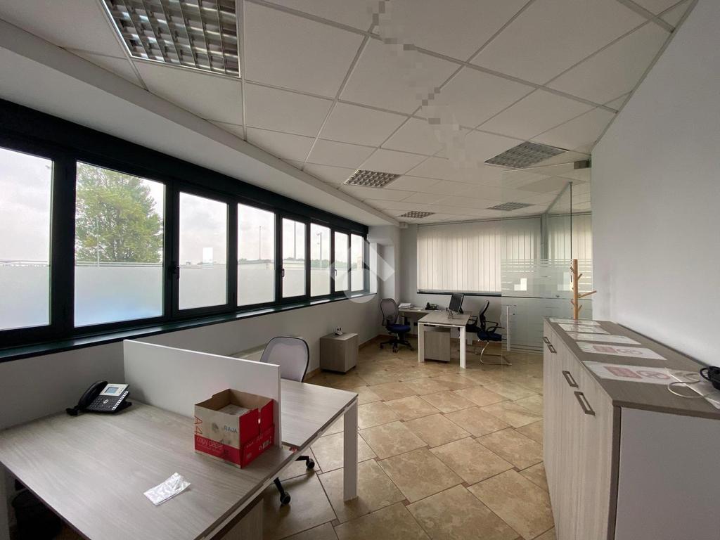 Completa il complesso un corpo uffici disposto su due piani: al piano terra si sviluppa un ampio open space con servizi dedicati, mentre al piano superiore si trovano quattro ambienti distinti, attualmente adibiti a esposizione, sala riunioni e uffici direzionali, anch’essi corredati da servizi.