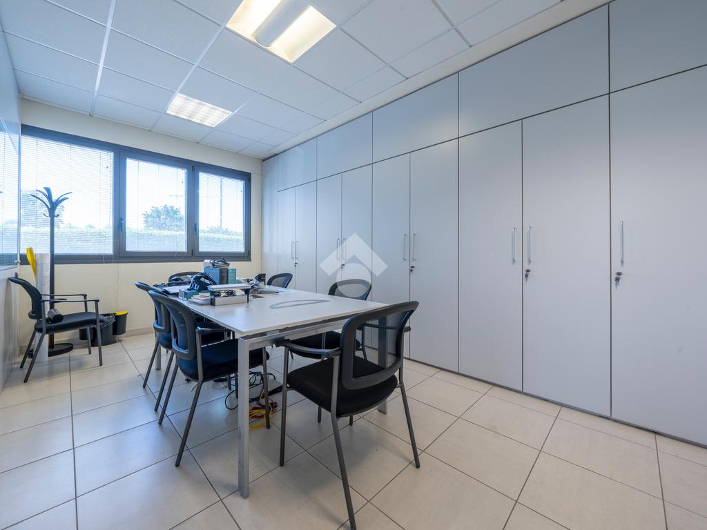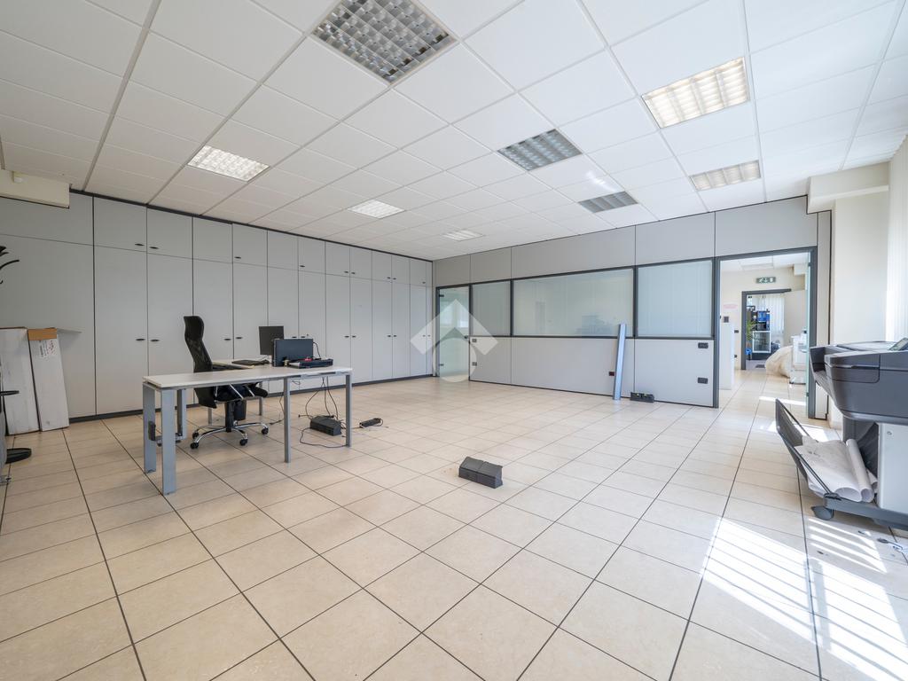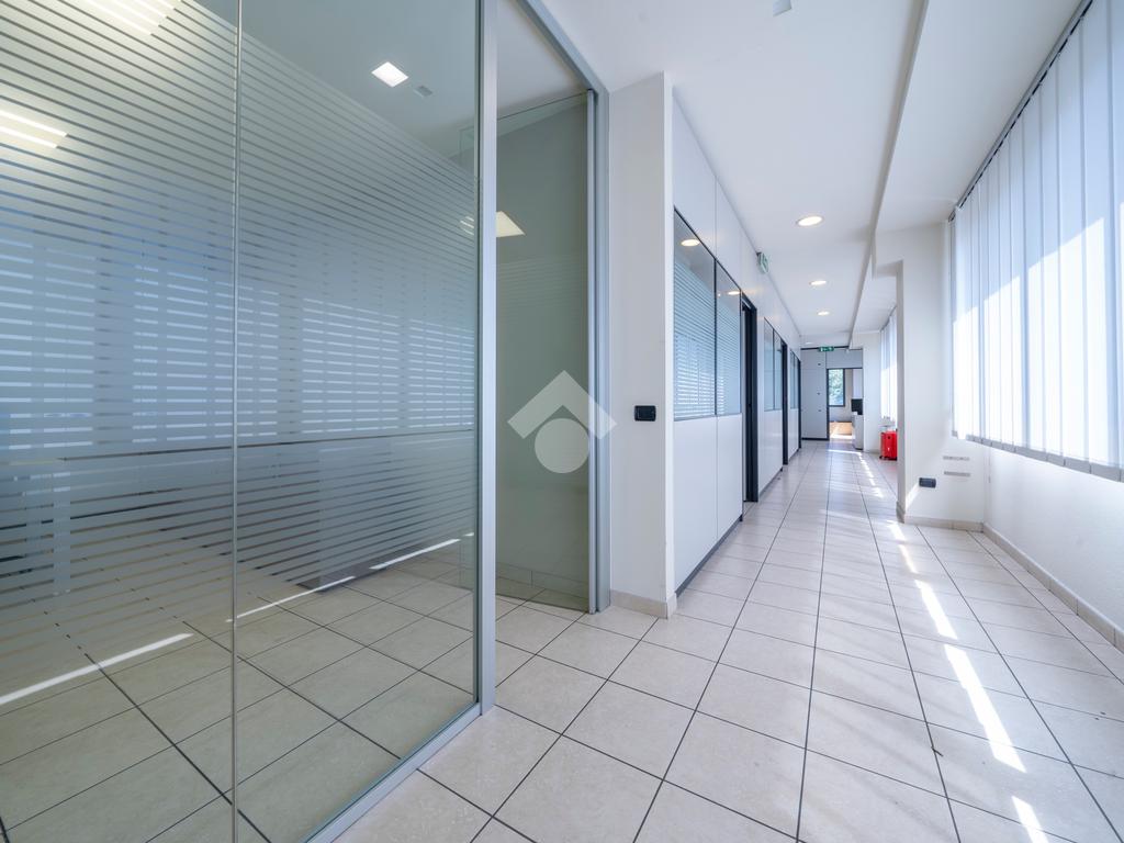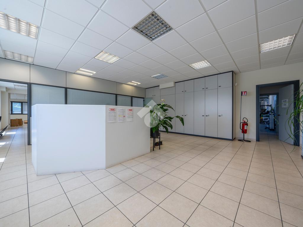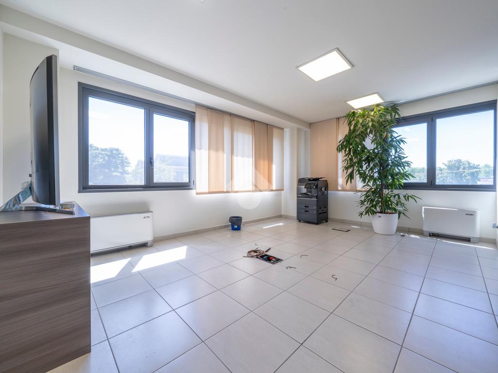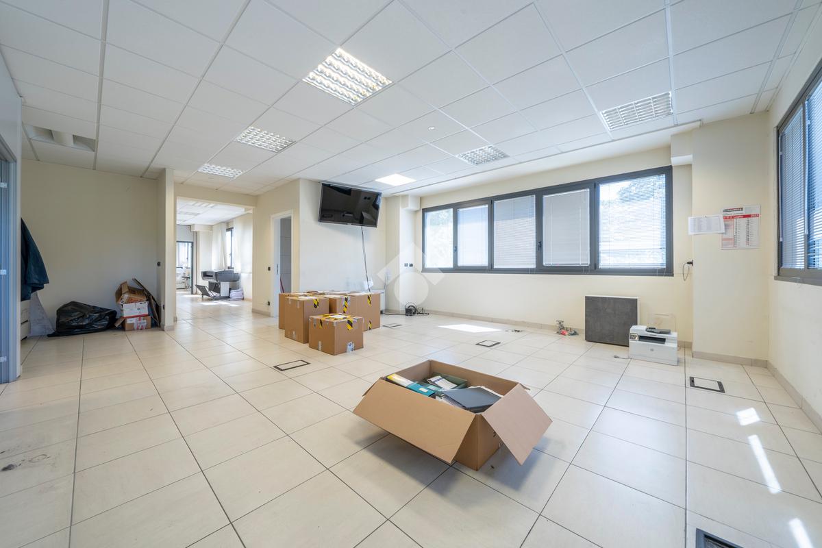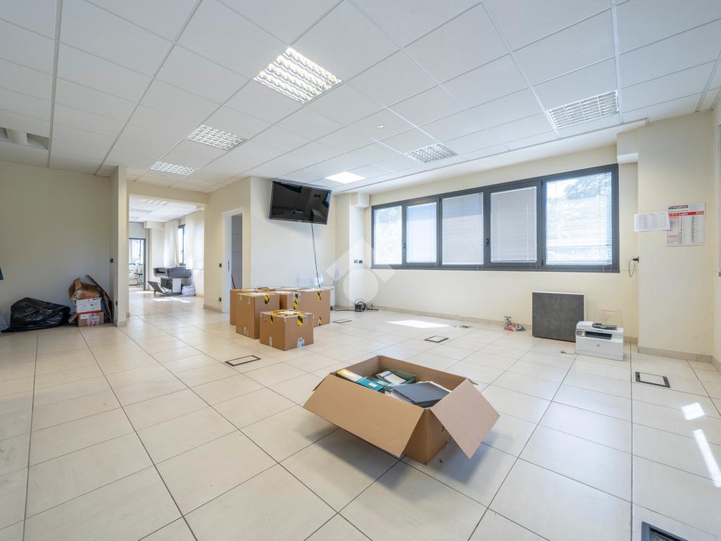 L'area uffici complessivamente di 450 mq si dispone su 2 piani e tutti gli ambienti e le sale riunioni sono completi di pareti attrezzate e tende. L'impianto elettrico presenta le torrette per le scrivanie, tutta la rete lan è cablata ed il riscaldamento e raffrescamento è affidato ad una pompa di calore con fancoil.