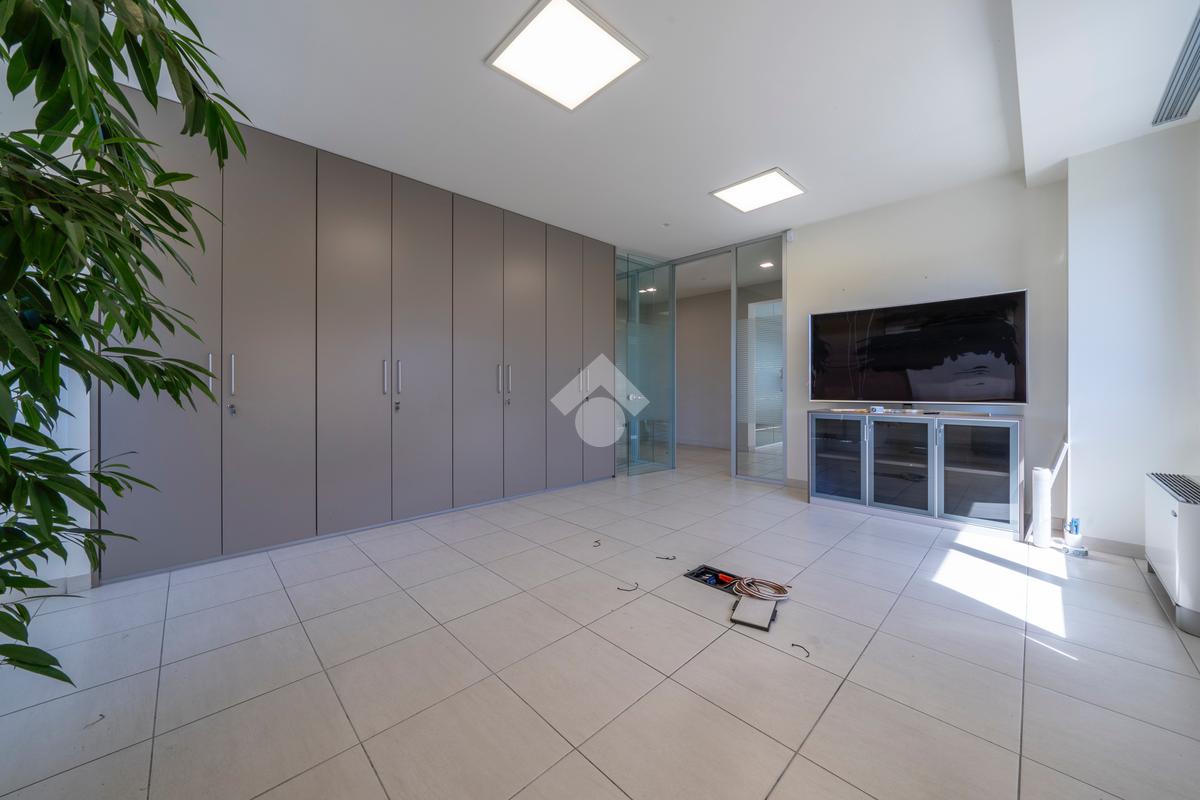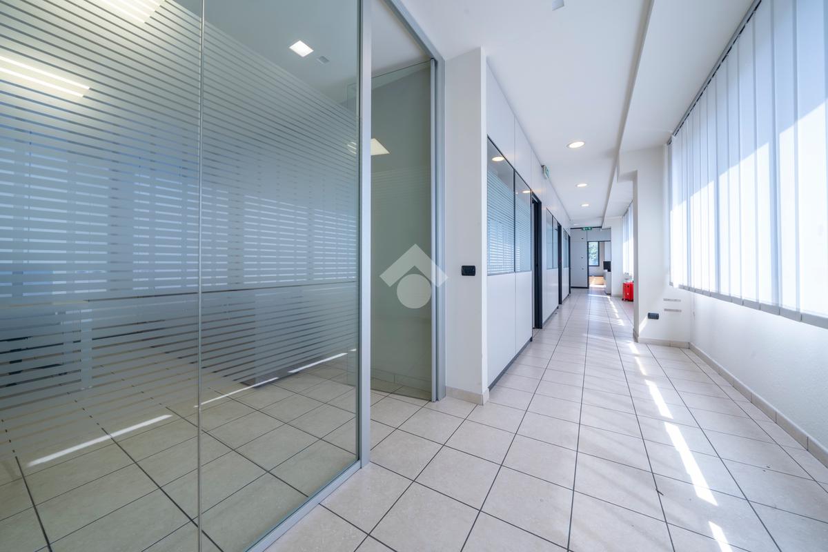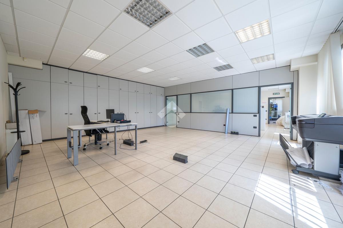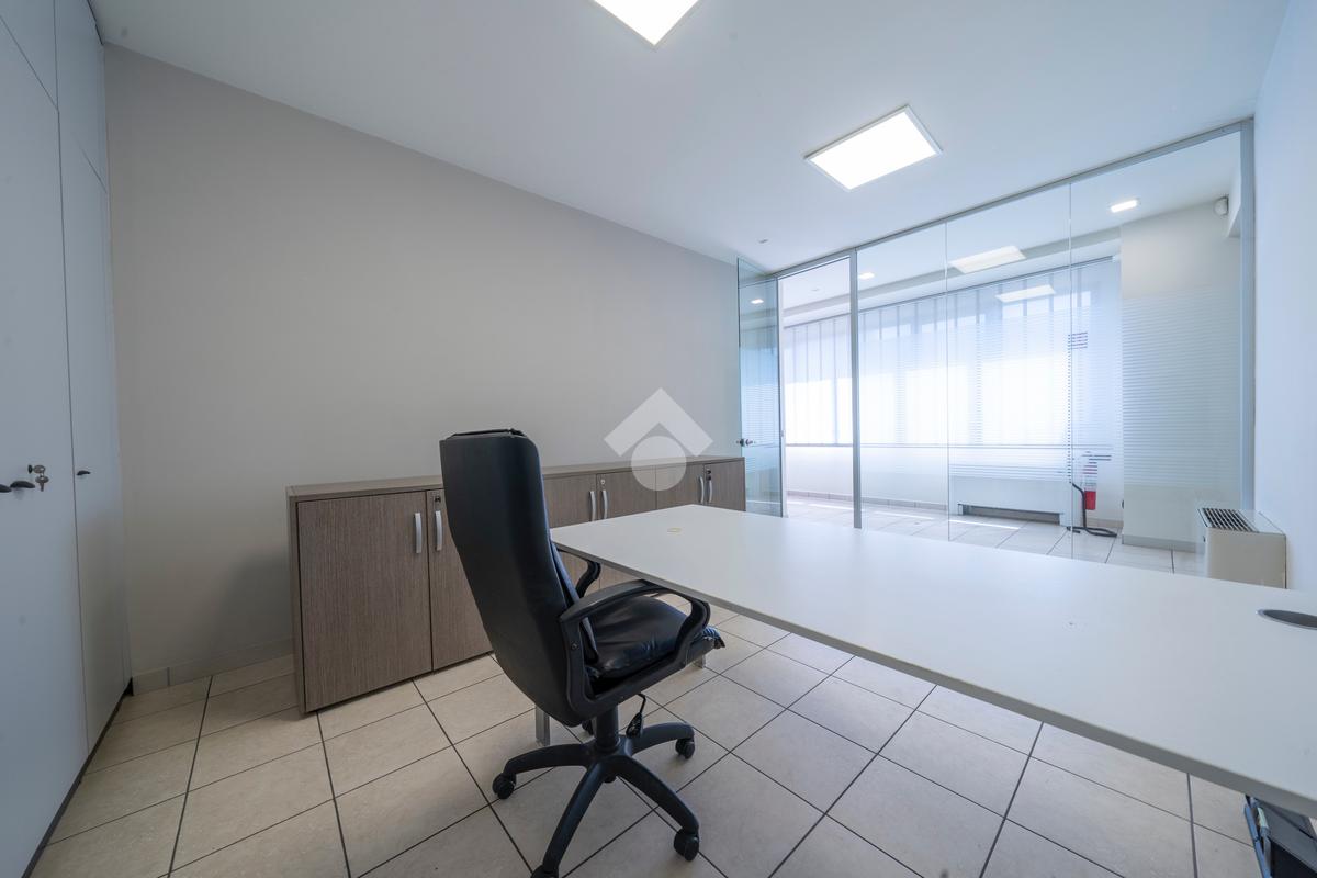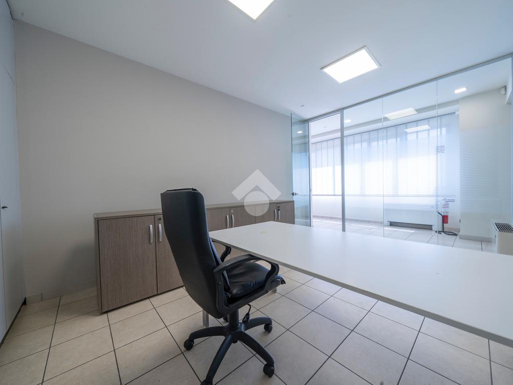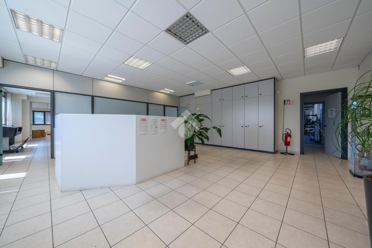 L'area uffici complessivamente di 450 mq si dispone su 2 piani e tutti gli ambienti e le sale riunioni sono completi di pareti attrezzate e tende. L'impianto elettrico presenta le torrette per le scrivanie, tutta la rete lan è cablata ed il riscaldamento e raffrescamento è affidato ad una pompa di calore con fancoil.