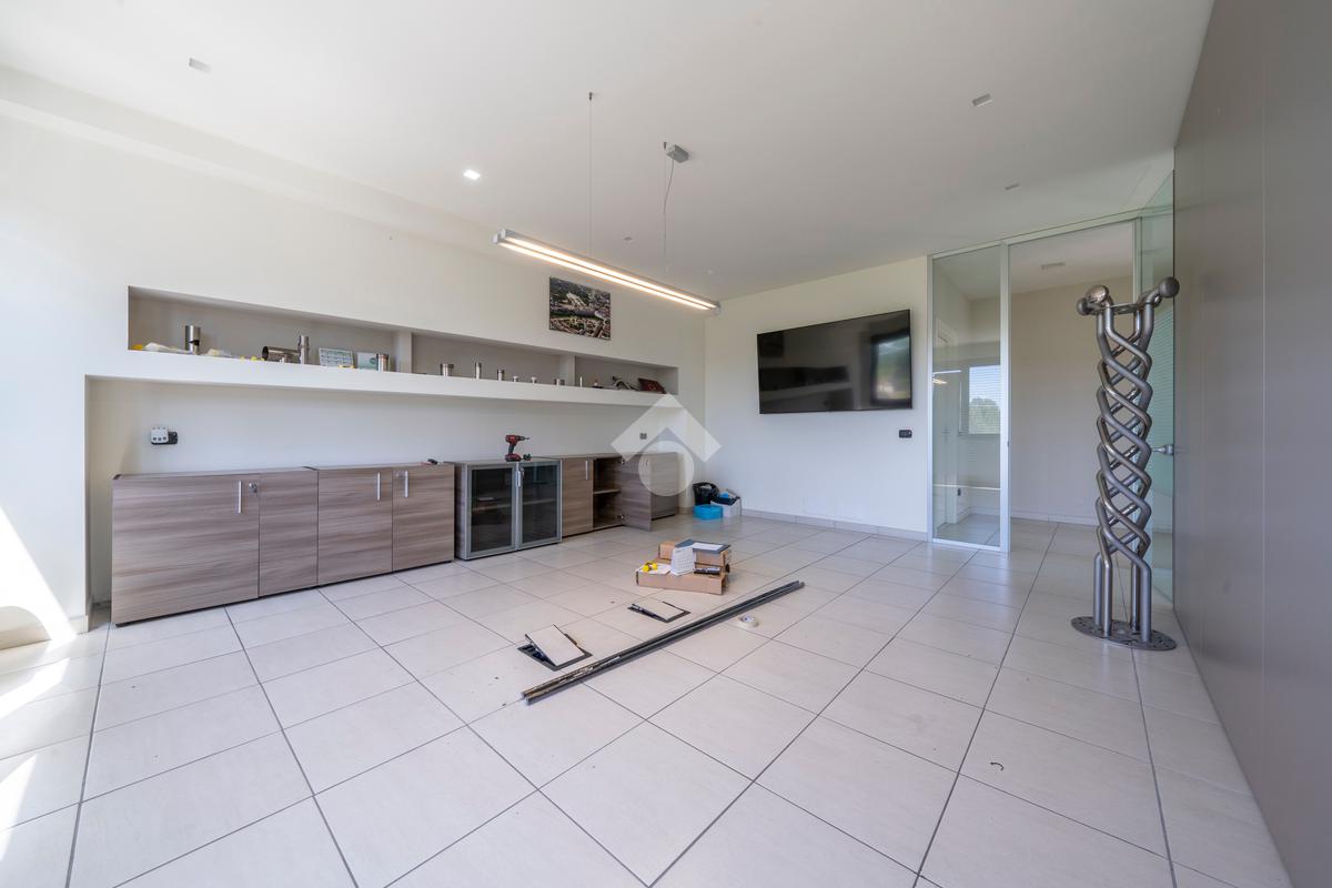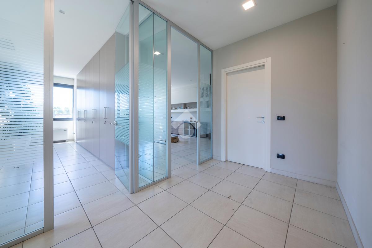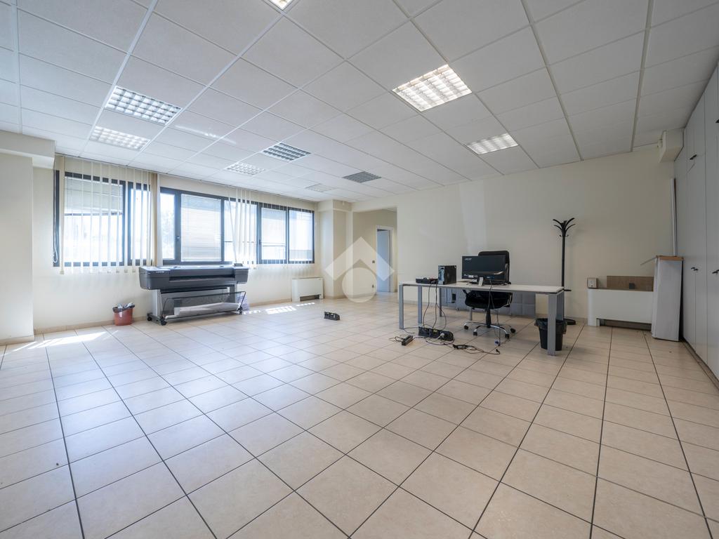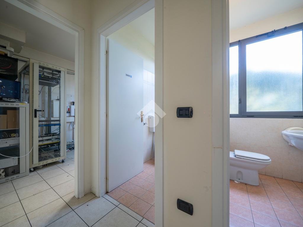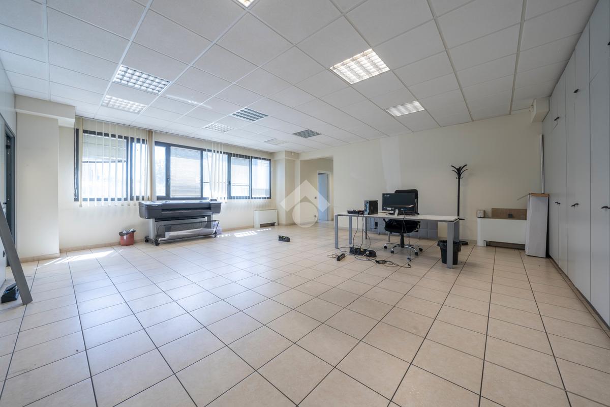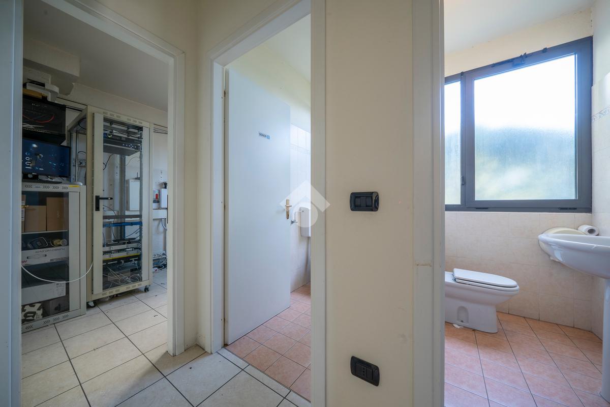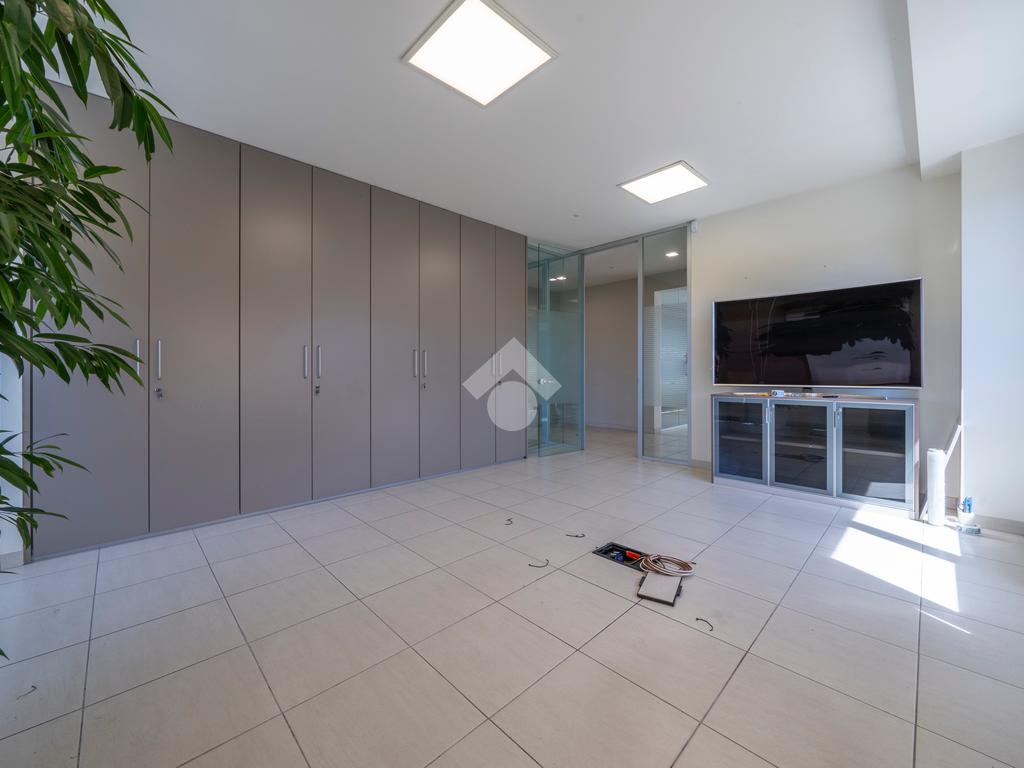 L'area uffici complessivamente di 450 mq si dispone su 2 piani e tutti gli ambienti e le sale riunioni sono completi di pareti attrezzate e tende. L'impianto elettrico presenta le torrette per le scrivanie, tutta la rete lan è cablata ed il riscaldamento e raffrescamento è affidato ad una pompa di calore con fancoil.